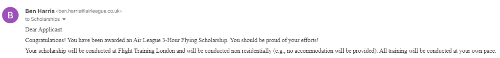 Today I was awarded a 3-hour flying scholarship from The Air League!